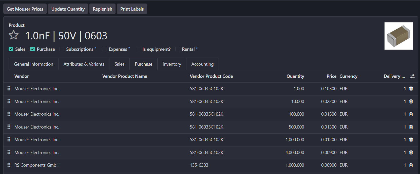 The new rosslight connector seamlessly integrates Mouser Electronics’ search and order APIs into our Odoo ERP system. It’s embedded within the purchasing module and can even be configured to update pricing daily—ensuring our data stays current and our procurement process remains efficient.